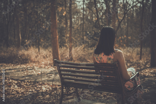 Sad Woman Sitting On The Bench From Back Angle In The Park Vintage