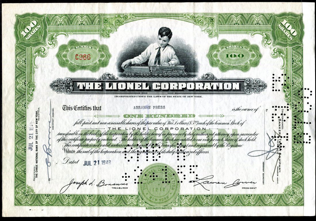 Lionel Corporation Sequential Stock Certificates Oct 07 2019