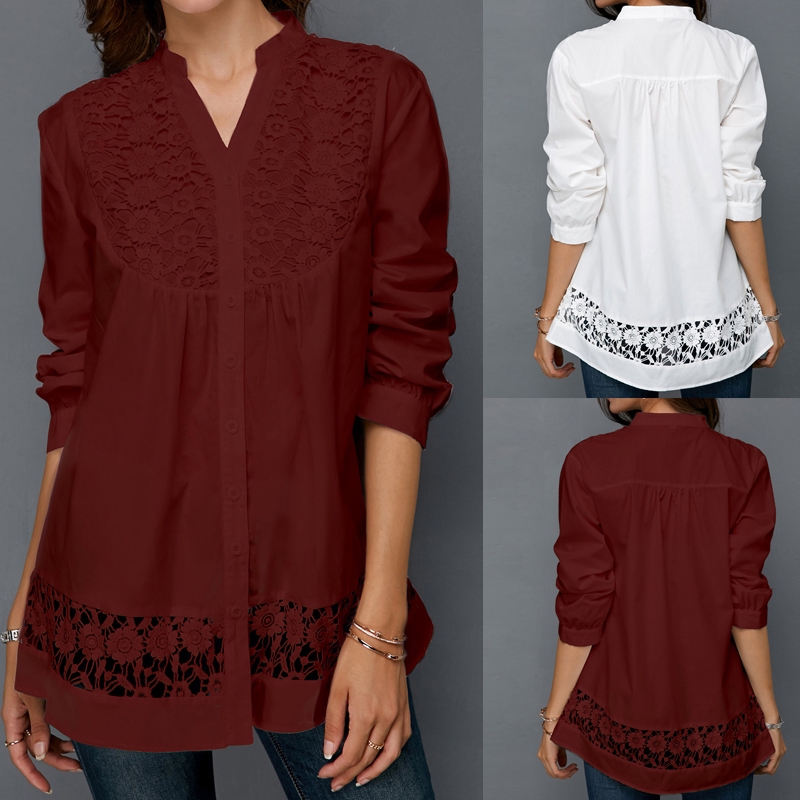 Plus Size Womens Button Up Retro Lace Floral Blouse Long Sleeve