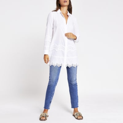 White Lace Embroidered Longline Shirt River Island